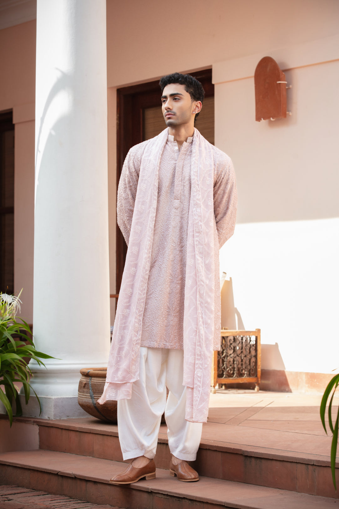 Kurta & Dupatta- Dusty Rose, Salwar - Off White