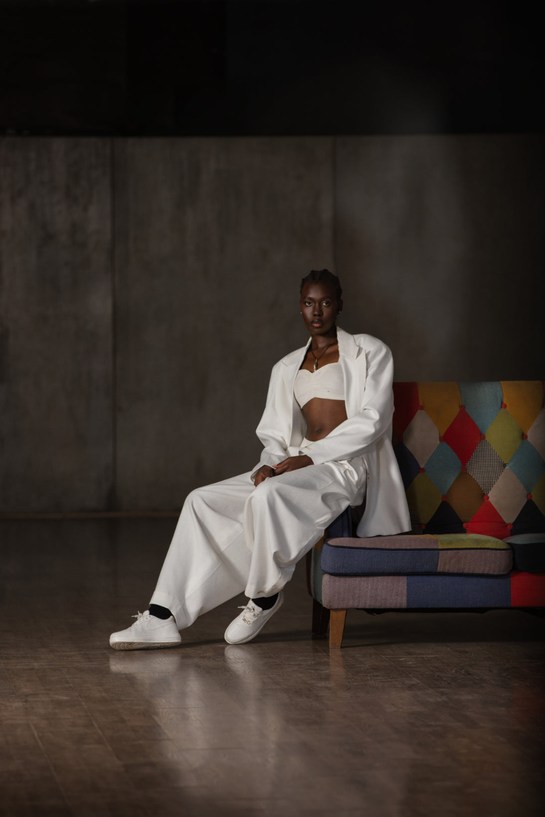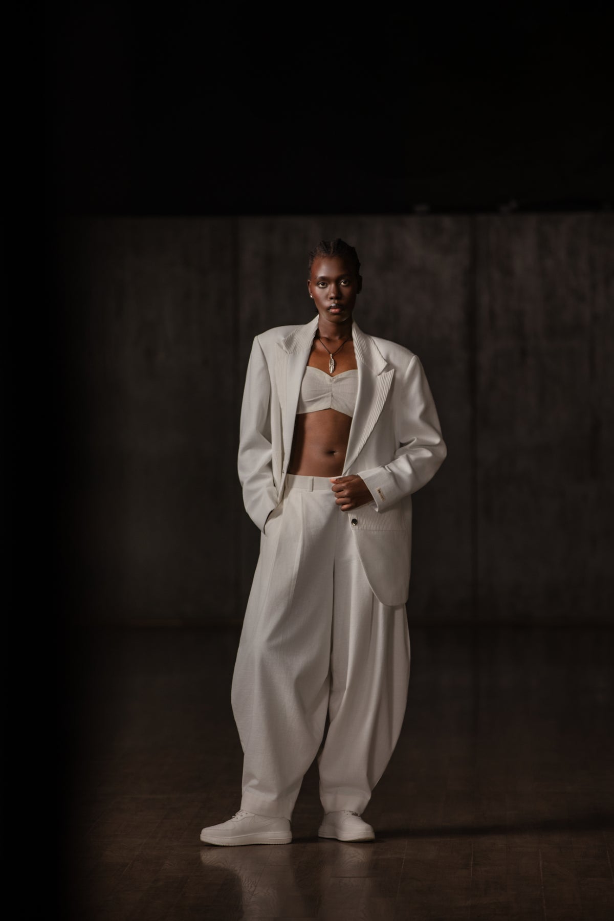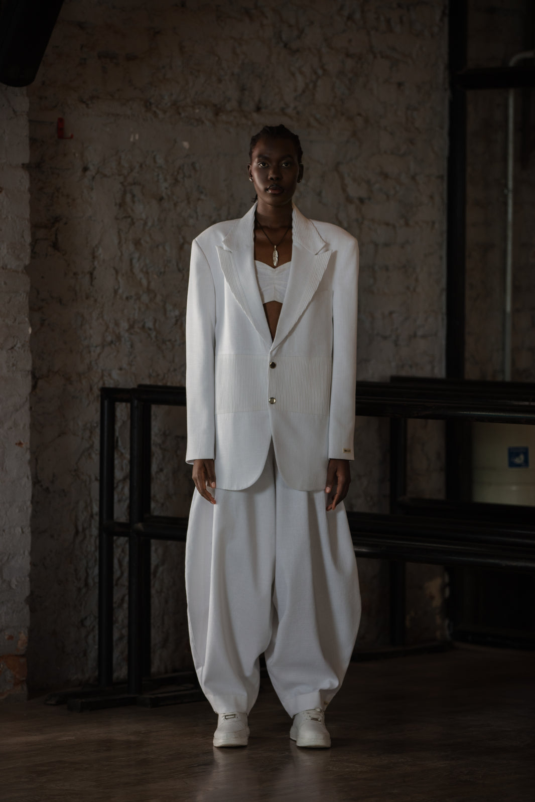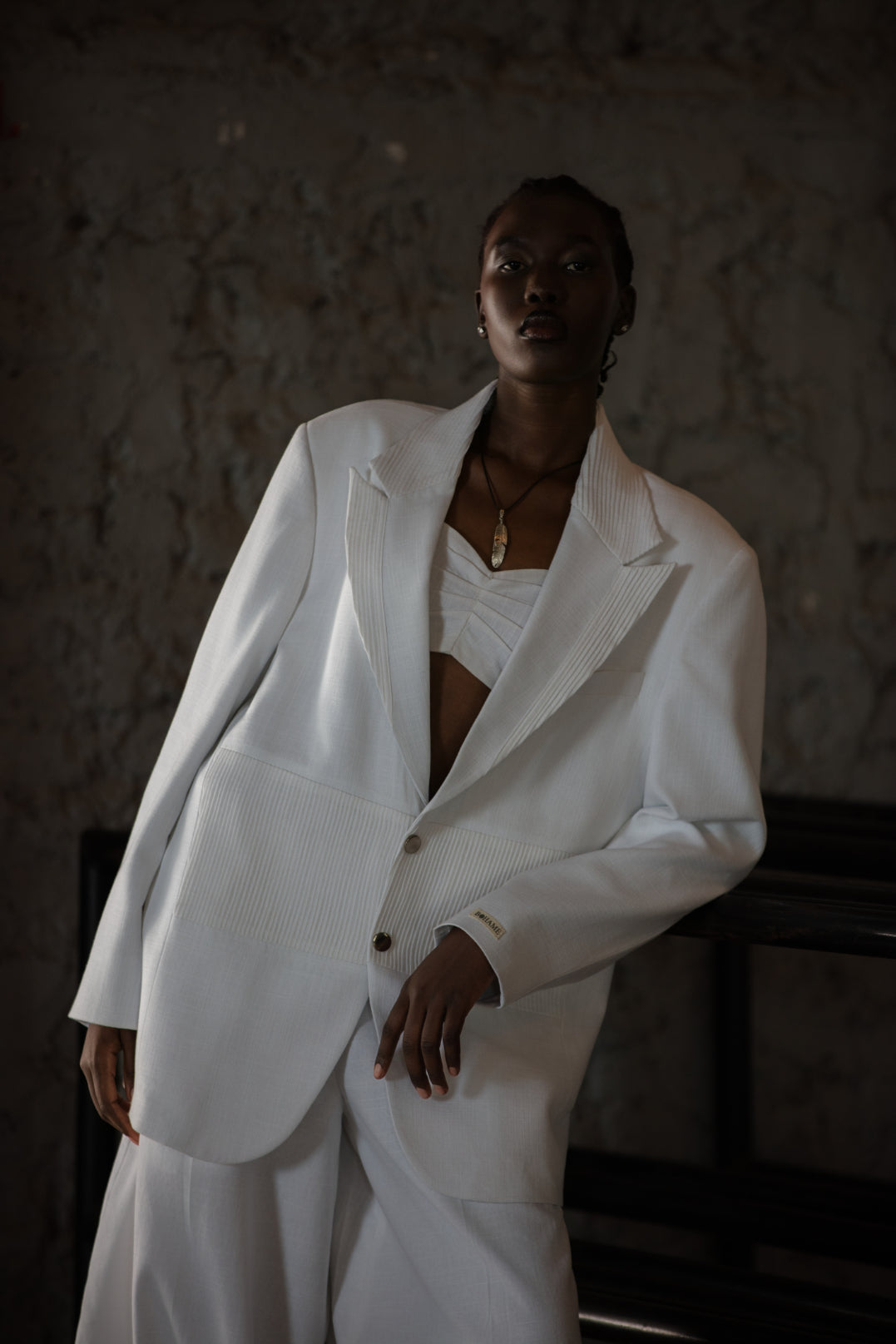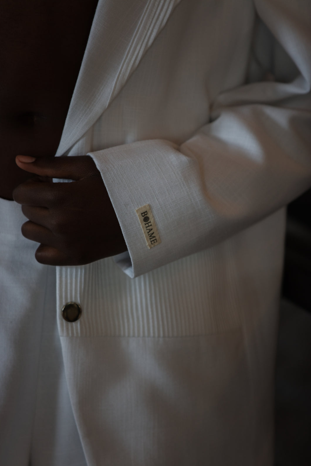 Forma is a statement linen blend blazer set that embodies modern structure with fluid ease. Designed in a white tone, the blazer features sharp lapels, subtle textural paneling, and a relaxed silhouette that exudes quiet confidence. Paired with voluminous, draped trousers, the set balances tailoring with movement, creating a bold yet refined look. The minimal yet striking aesthetic makes it versatile for both elevated daywear and contemporary occasions. Crafted with precision, every detail reflects a commitment to form, comfort, and timeless design.