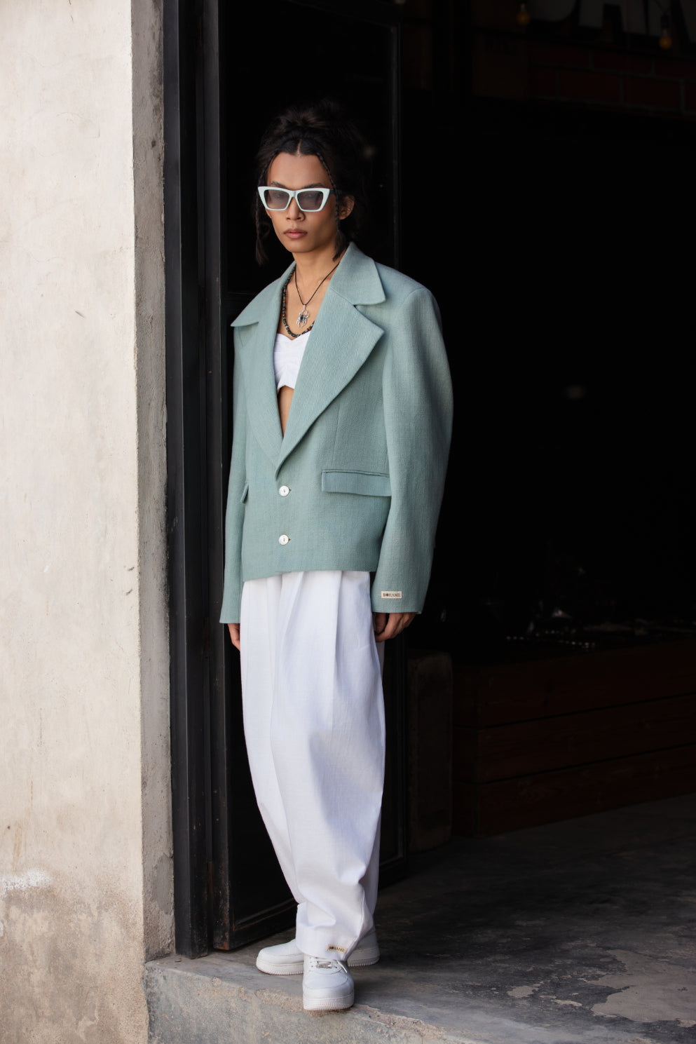 Umbra is a contemporary herringbone fabric blazer with linen blend pants that brings together softness and structure in a refreshing sage tone. The blazer features sharp lapels, clean lines, and a cropped yet relaxed silhouette that adds a modern edge to classic tailoring. Paired with fluid, balloon trousers, the set creates a harmonious balance between structure and movement. Designed in an oversized fit, it offers effortless comfort while maintaining a refined aesthetic, making it ideal for both daywear and elevated styling.