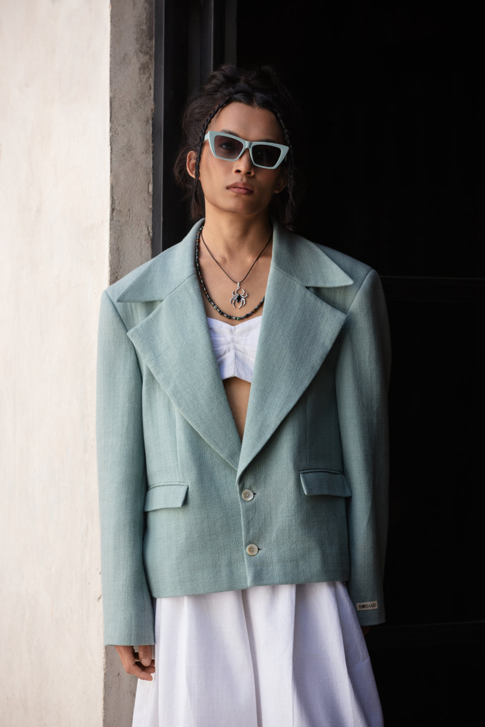 Umbra is a contemporary herringbone fabric blazer with linen blend pants that brings together softness and structure in a refreshing sage tone. The blazer features sharp lapels, clean lines, and a cropped yet relaxed silhouette that adds a modern edge to classic tailoring. Paired with fluid, balloon trousers, the set creates a harmonious balance between structure and movement. Designed in an oversized fit, it offers effortless comfort while maintaining a refined aesthetic, making it ideal for both daywear and elevated styling.
